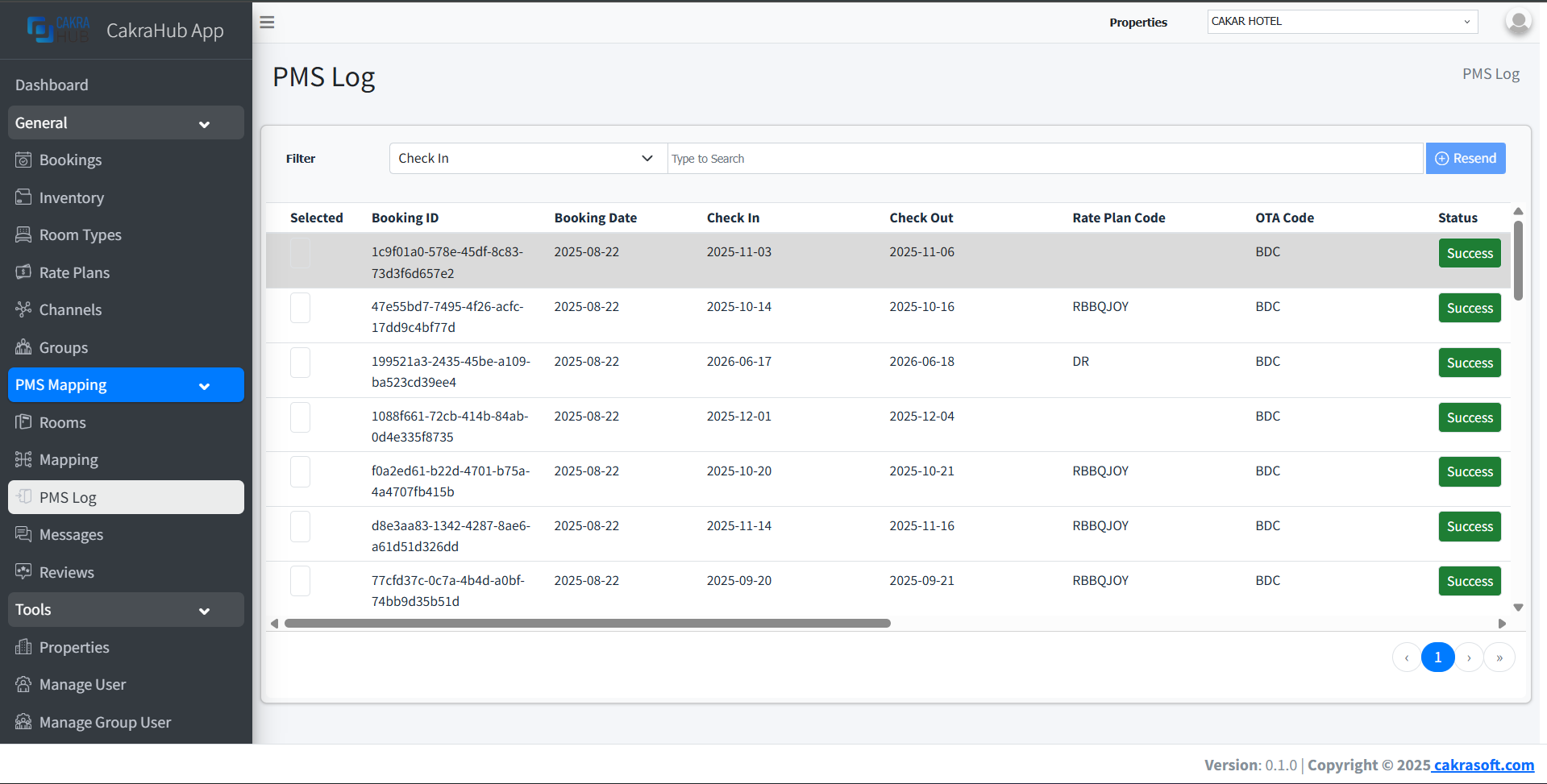 The PMS Log menu is used to monitor booking transmission status from Channel Manager to PMS. With this menu, you can see whether bookings were successful, pending, or failed, making the integration monitoring process more transparent and easy to monitor.