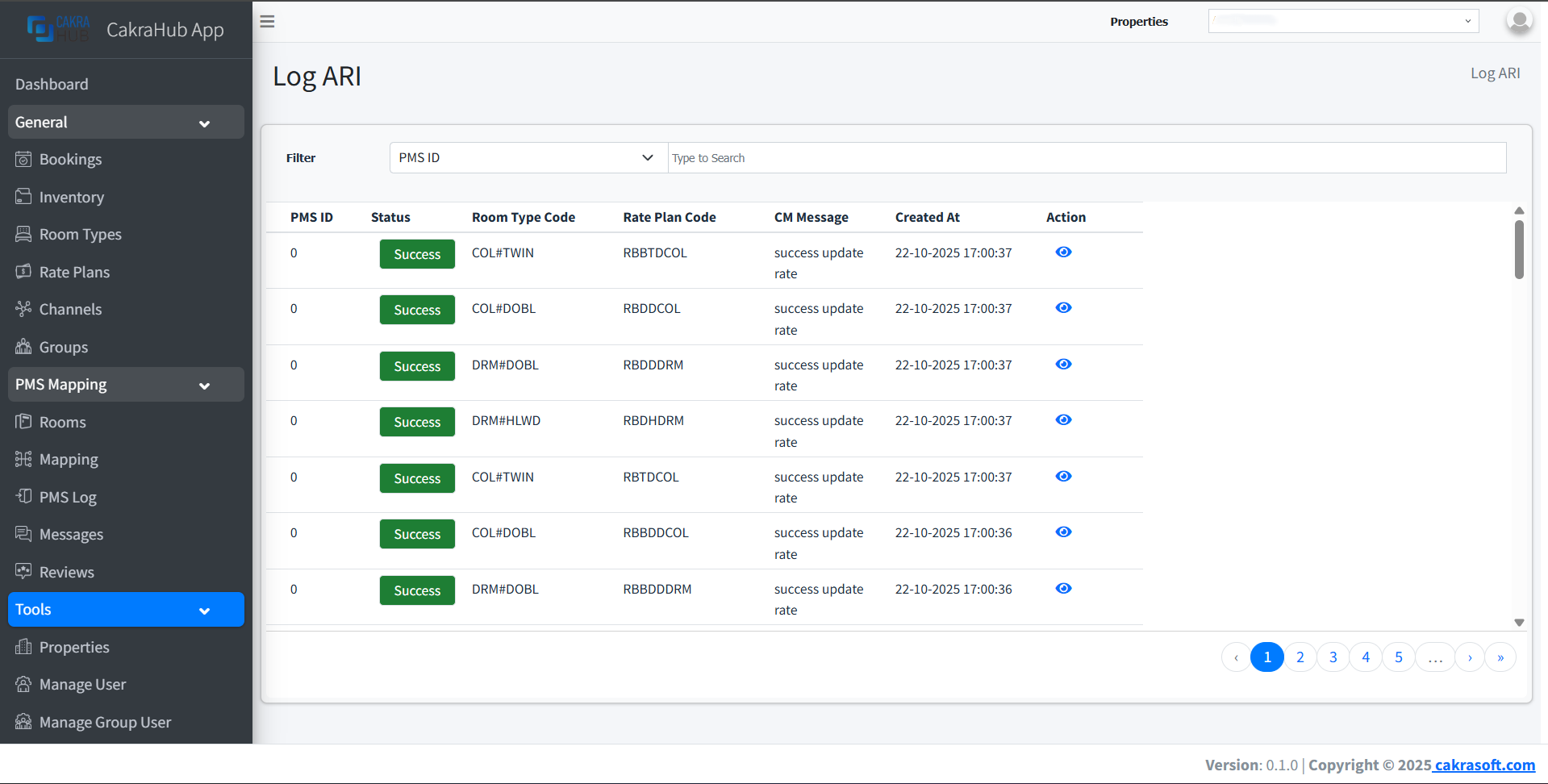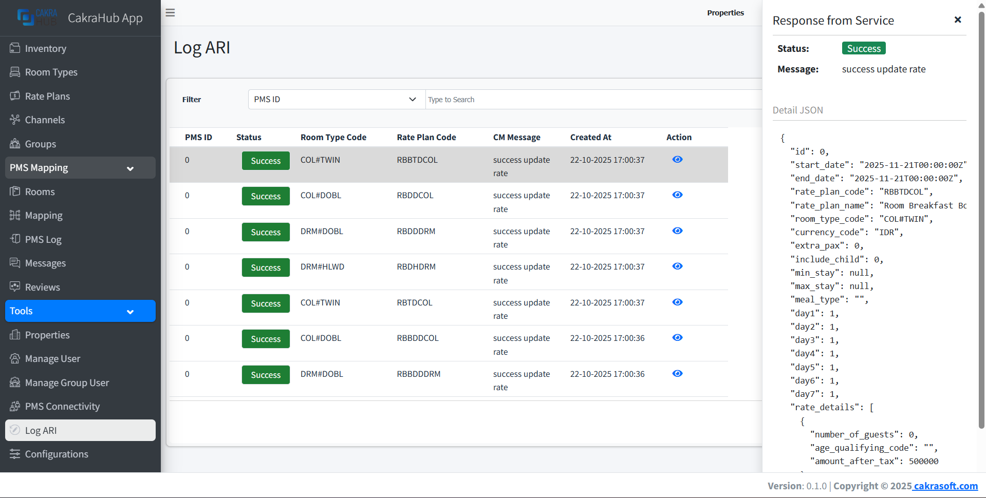 The Log ARI menu is used to monitor the status of ARI (Availability, Rate, Inventory) data transmission from PMS to Channel Manager. With this menu, you can see whether ARI data was successful or failed, making the integration monitoring process more transparent and easy to monitor.